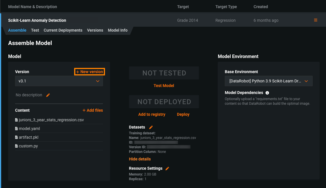 If you want to update a model due to new package versions, different preprocessing steps, hyperparameters, and more, you can update the file contents to create a new version of the model. To upload a new version of a custom model environment, see Add an environment version.
