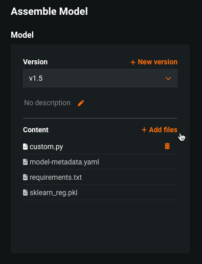 When you update the contents of a model, the minor version (1.1, 1.2, etc.) of the model automatically updates. To create a minor custom model version, select the model from the Custom Model Workshop and navigate to the Assemble tab. Under the Model header, click Add files and upload the files or folders you updated. The minor version is also updated if you delete a file.