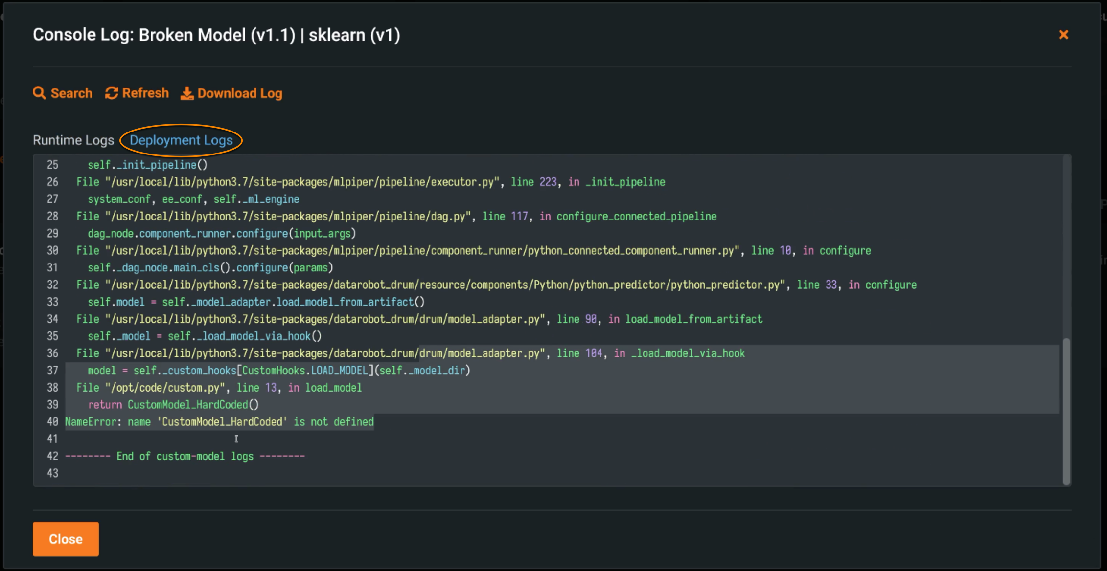 When you deploy a custom model, it generates log reports unique to this type of deployment, allowing you to debug custom code and troubleshoot prediction request failures from within DataRobot.