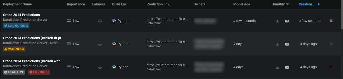 When DataRobot deploys a custom model, a Launching badge appears under the deployment name in the deployment inventory, and on any tab within the deployment. The following deployment status values are available for custom model deployments: