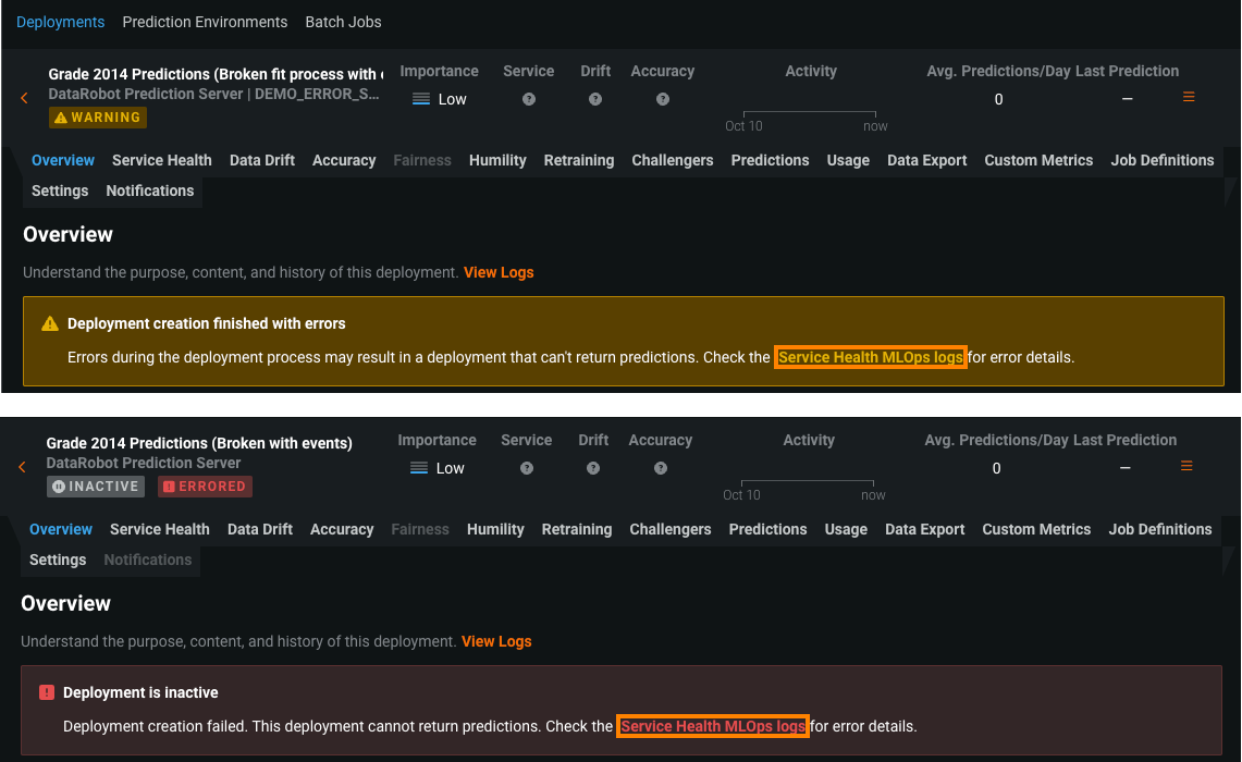 The custom model deployment process completed with errors. You may be unable to make predictions through this deployment; however, if you deactivate this deployment, you can't reactivate it until you resolve the deployment errors. You should check the MLOps Logs to troubleshoot the custom model deployment. |