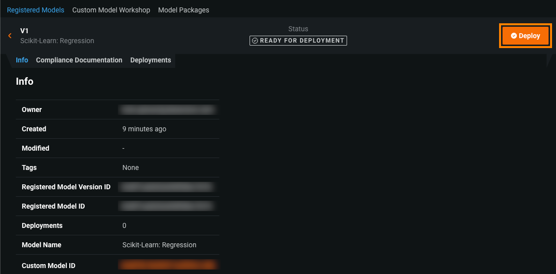 Navigate to Model Registry > Custom Model Workshop > Models and select the model you want to deploy.