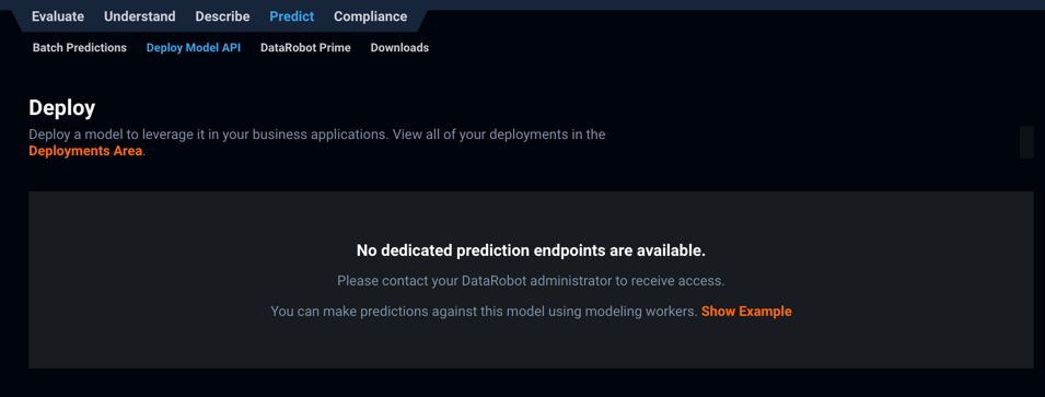 The Deploy tab behaves differently in environments without a dedicated prediction server, as described in the section on shared modeling workers.