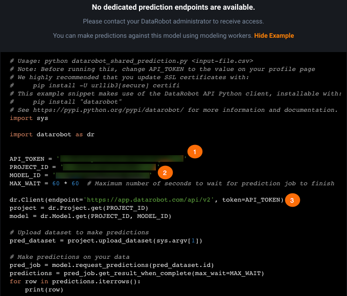 Field Description 1 API_TOKENThe API key. 2 PROJECT_ID/MODEL_IDThe project and model IDs, available in the sample. 3 dr.Client(endpoint='https://app.datarobot.com/api/v2', token=API_TOKEN)The shared instance endpoint, available in the sample. The DataRobot Python client uses the API key you set for authentication so no key or username is required. -