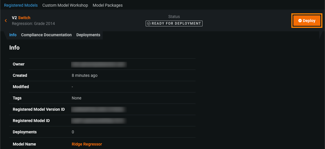 While the registered model builds, click Deploy and then configure the deployment settings.