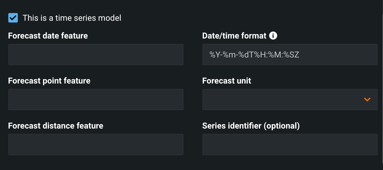 Prediction column The column name in the holdout dataset containing the prediction result. If registering a time series model, select the This is a time series model checkbox and configure the following fields: