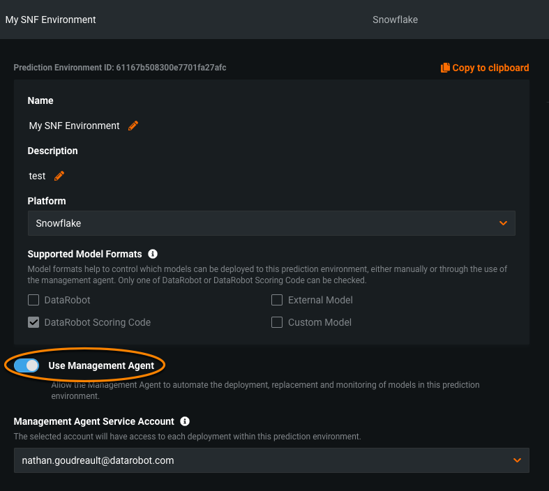 Once enabled, you must indicate the email address of the management agent service account holder. DataRobot recommends using an administrative service account as the account holder (an account that has access to each deployment that uses the configured prediction environment).