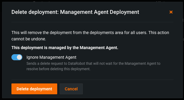 In the Delete deployment dialog box, click Ignore Management Agent, and then click Delete deployment.