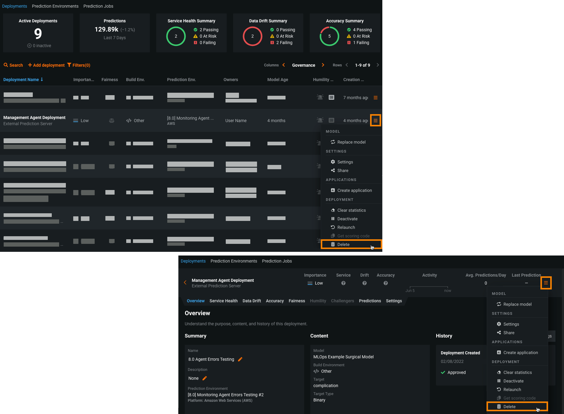On the Deployments page or any tab within a deployment, next to the name of the deployment you want to delete, click the Actions menu and click Delete.