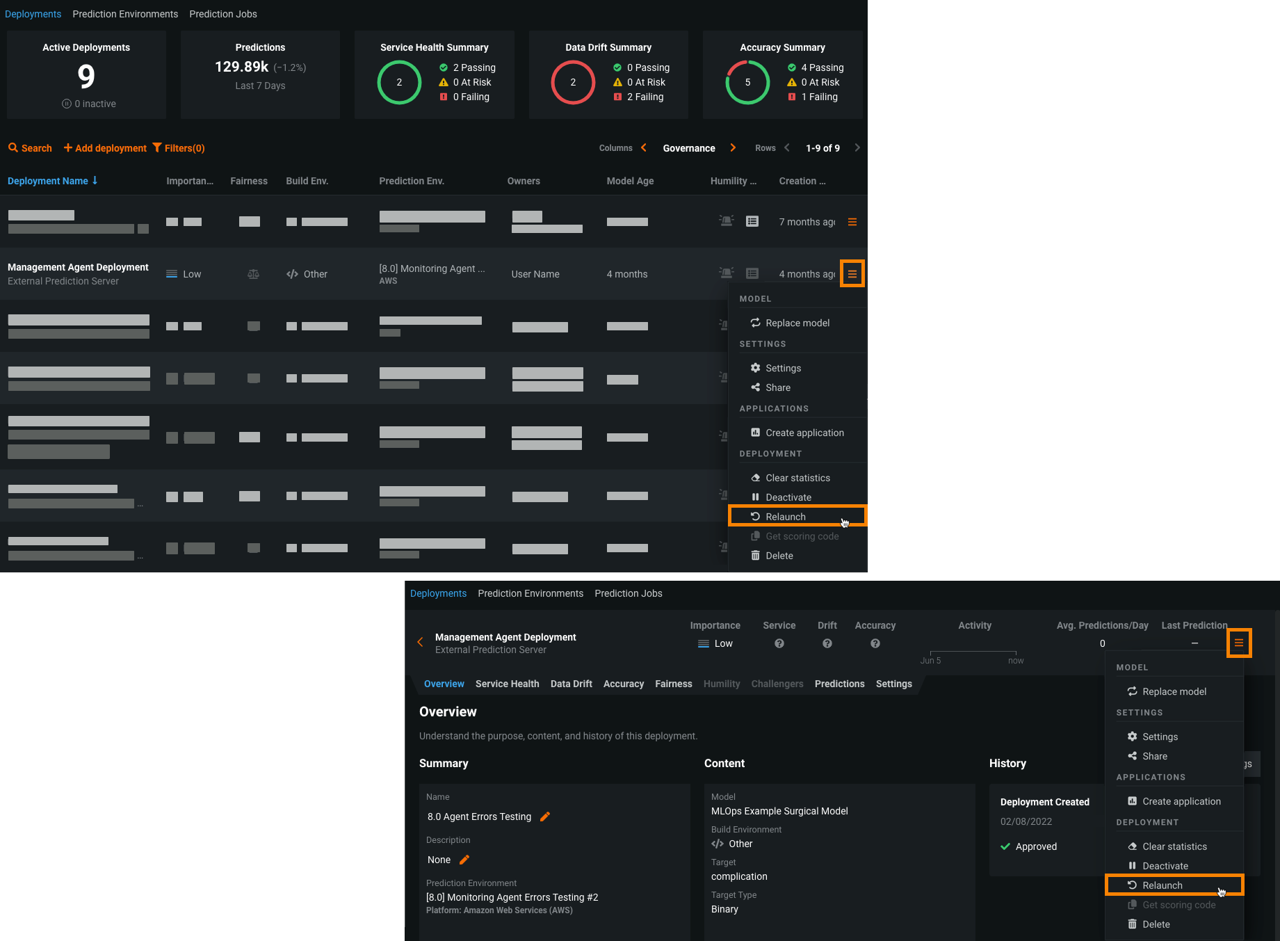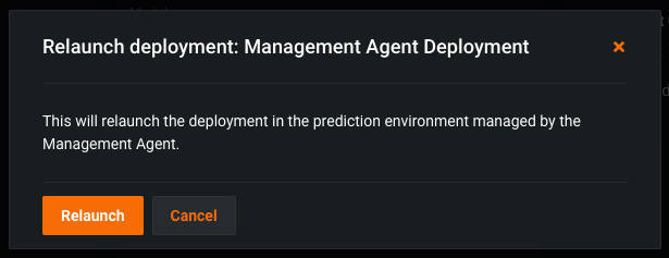 To manually relaunch a management agent deployment without changes to the deployment's metadata, you can trigger a relaunch from the deployment's Actions menu .