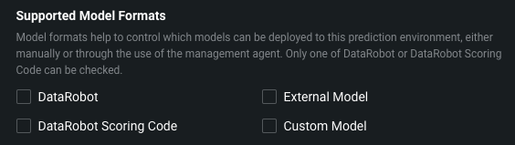 Under Supported Model Formats, select one or more formats to control which models can be deployed to the prediction environment, either manually or using the management agent. The available model formats are DataRobot or DataRobot Scoring Code, External Model, and Custom Model.