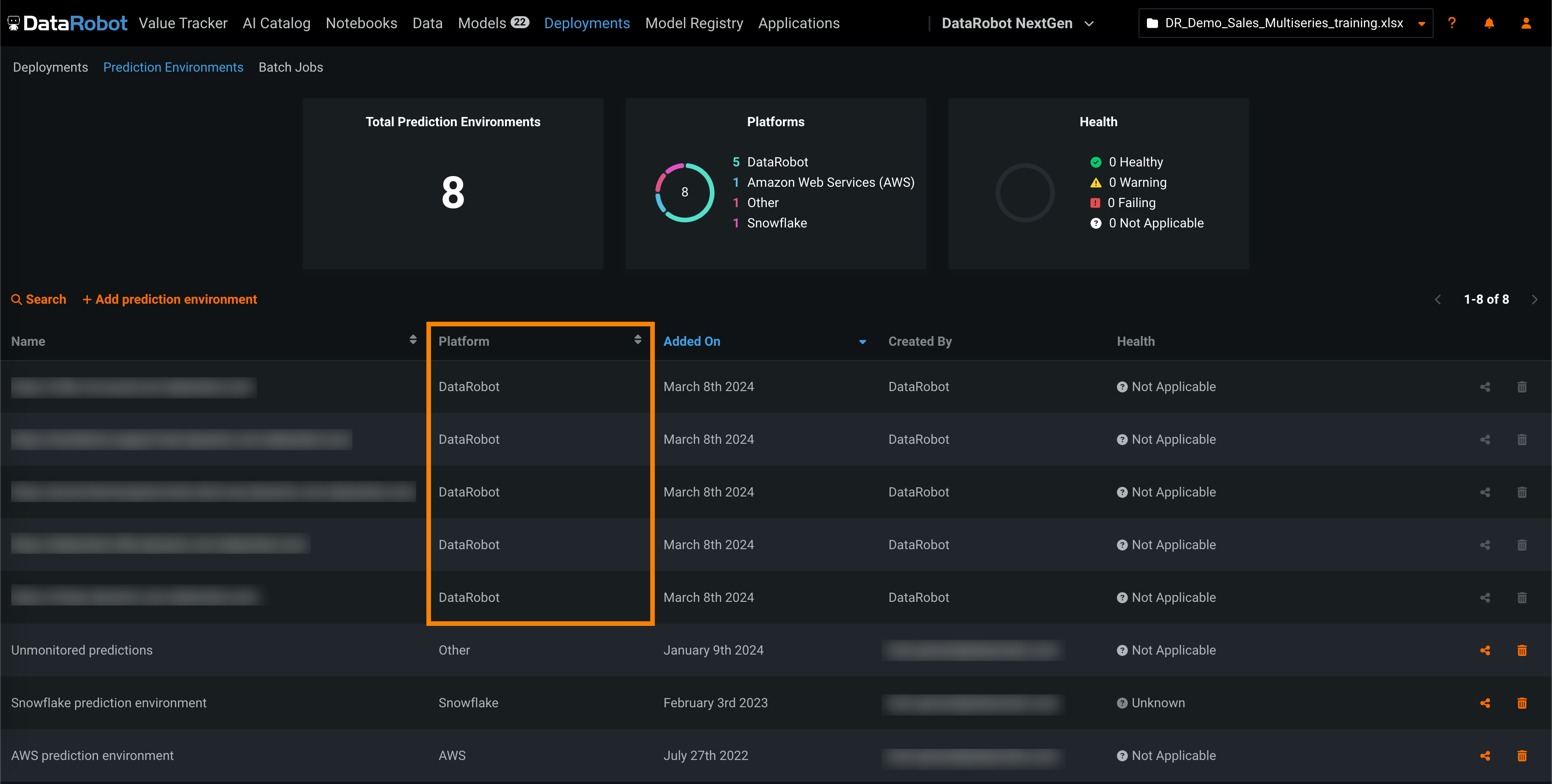 From the Prediction environments page, you can view DataRobot prediction environments, and create, edit, delete, or share serverless and external prediction environments. You can also review the DataRobot prediction environments available to your organization by locating the environments with DataRobot in the Platform column: