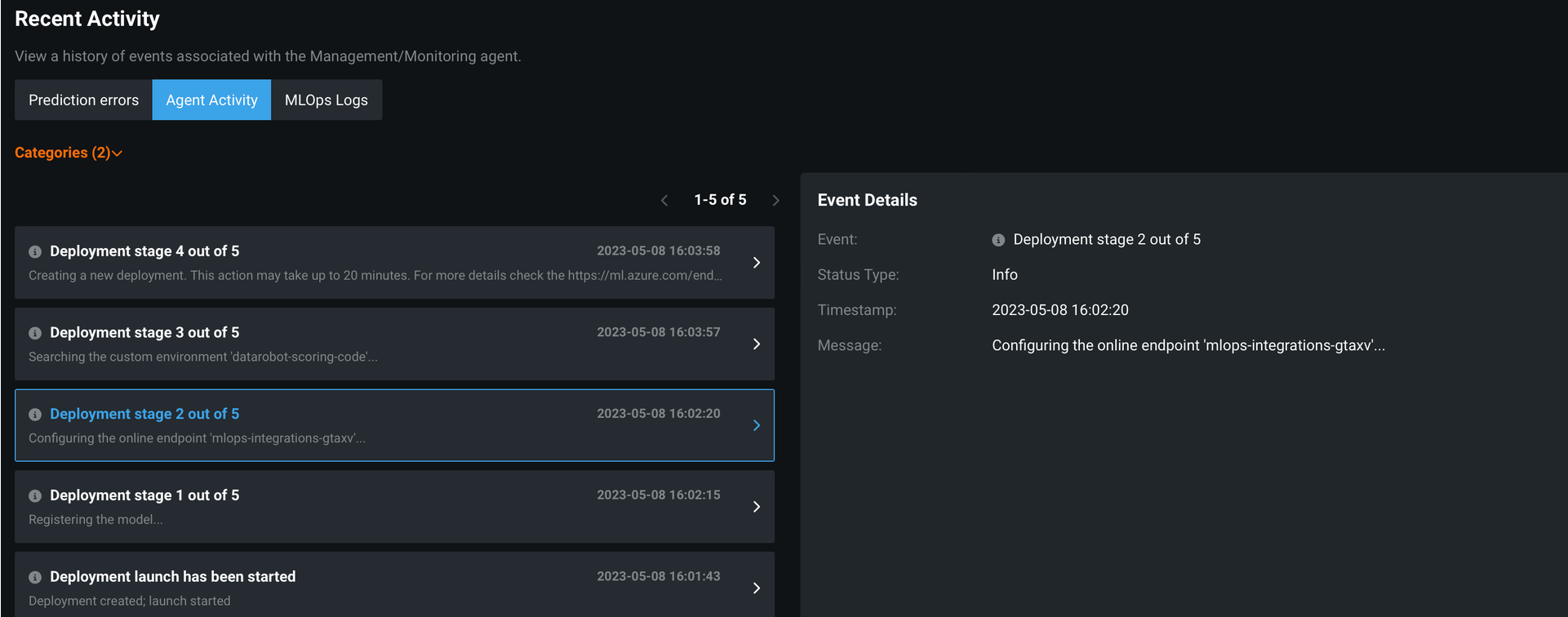 While the deployment is Launching, you can monitor the status events on the Service Health tab in Recent Activity > Agent Activity: