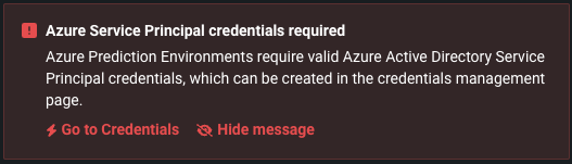 DataRobot management of Scoring Code in AzureML requires existing Azure Service Principal Credentials. If you don't have existing credentials, the Azure Service Principal credentials required alert appears, directing you to Go to Credentials to create Azure Service Principal credentials.