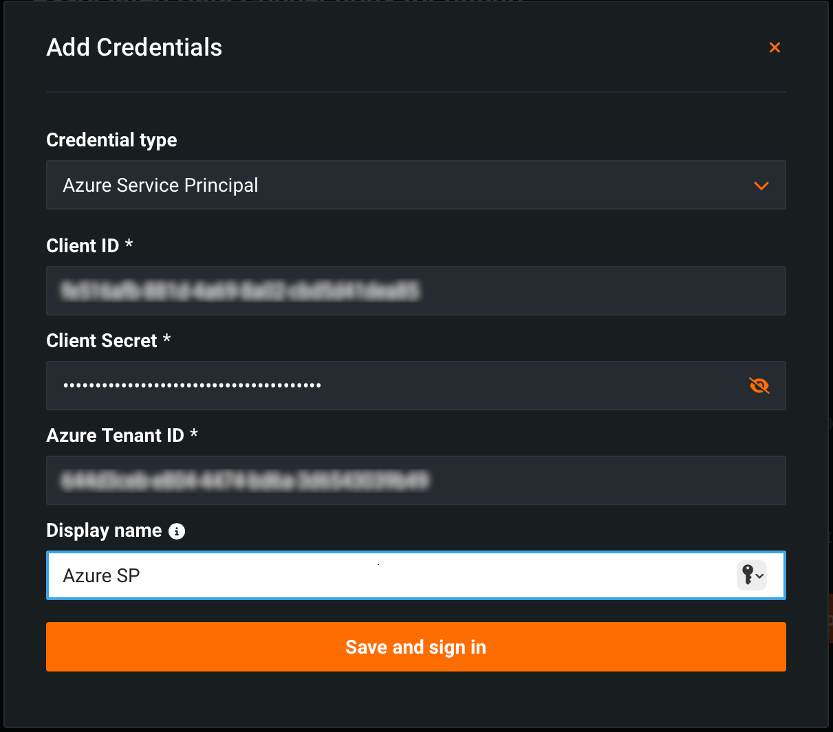 To create the required credentials, for Credential type, select Azure Service Principal. Then, enter a Client ID, Client Secret, Azure Tenant ID, and a Display name. To validate and save the credentials, click Save and sign in.