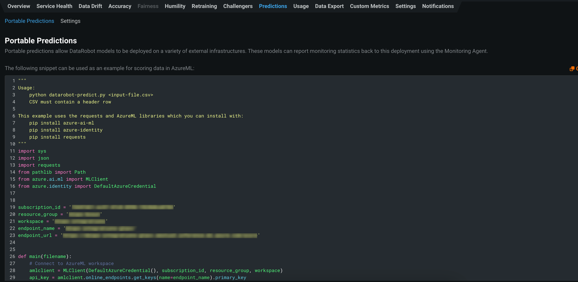Automated deployment and replacement of Scoring Code in AzureML is a premium feature. Contact your DataRobot representative or administrator for information on enabling this feature.