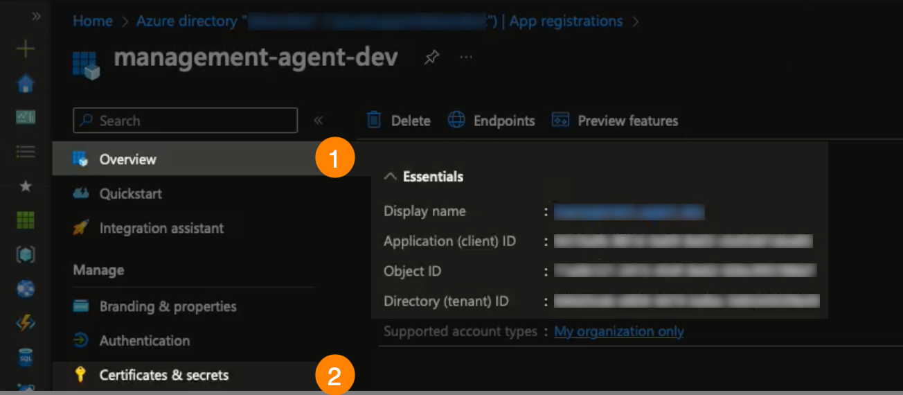 You can find these IDs and the display name on Azure's App registrations > Overview tab (1). You can generate secrets on the App registration > Certificates and secrets tab(2):