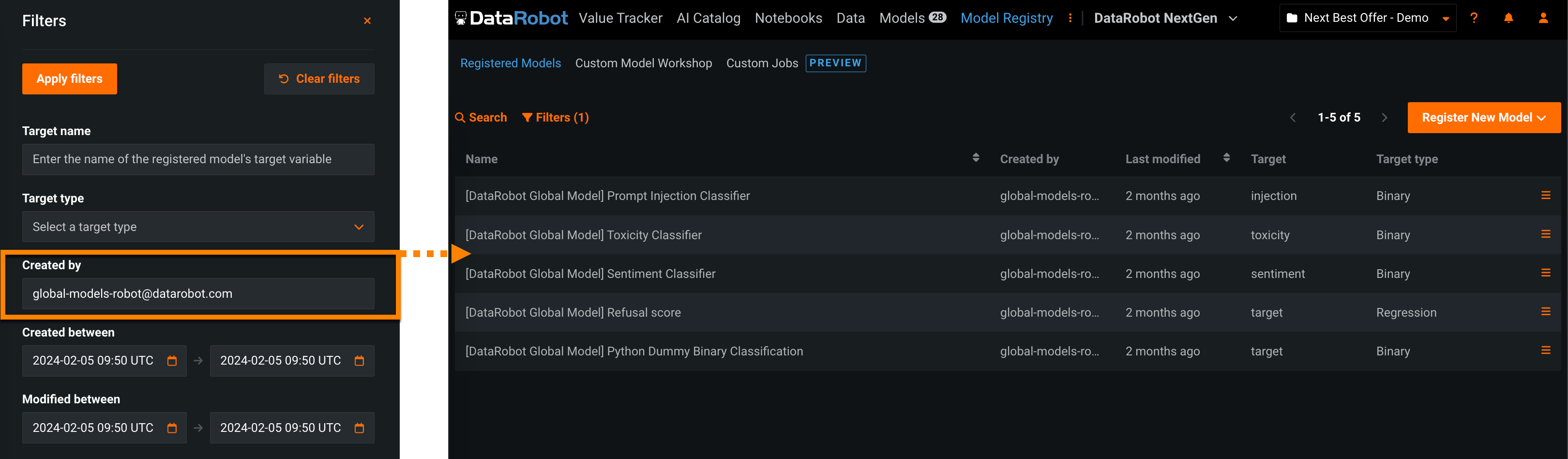 To identify the global models created by DataRobot on the Model Registry > Registered Models page, click Filters, enter global-models-robot@datarobot.com in the Created by field, then click Apply filters: