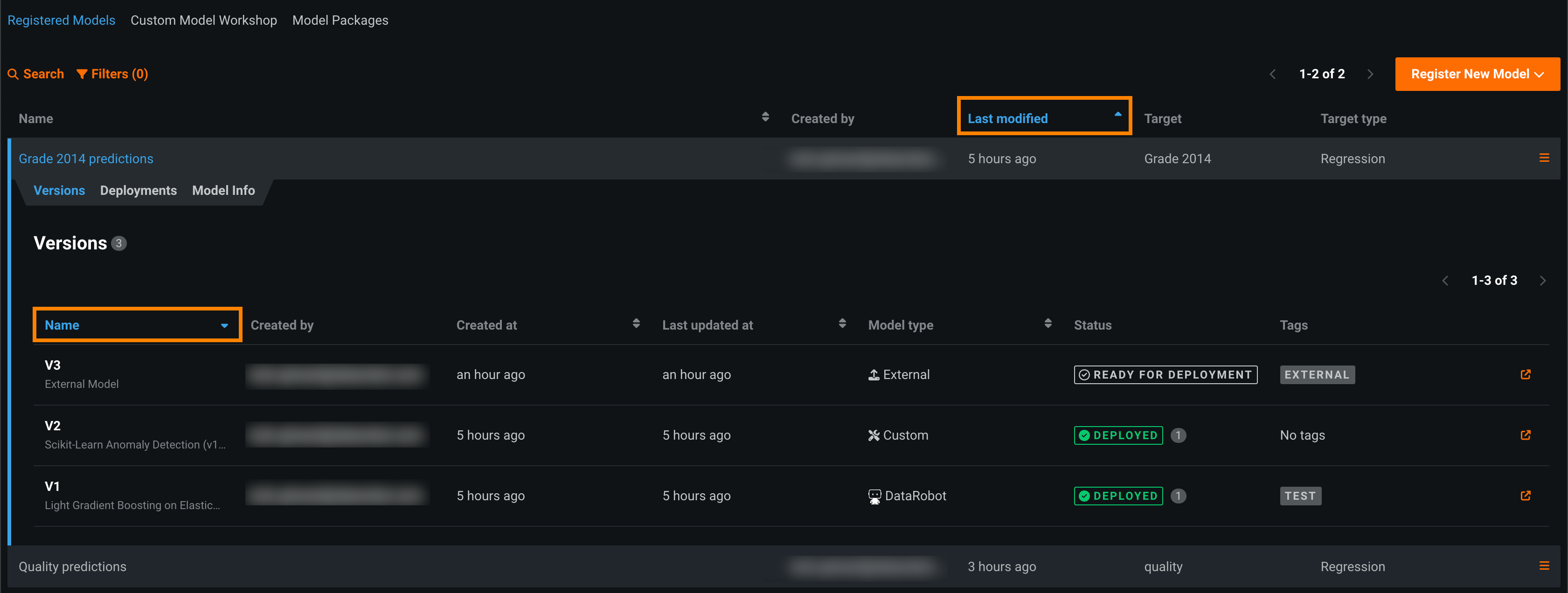 On the Registered Models page, you can sort registered models by Name or Last modified. In a registered model, on the Versions tab, you can sort versions by Name, Created at, Last updated at, or Model type: