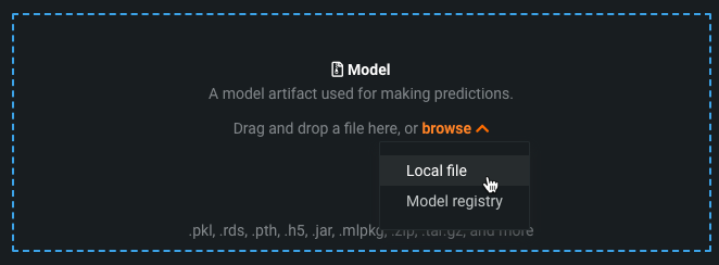 Under the Add a model header, click Browse and click Local file to upload your model package. You can also drag and drop a model package file into the Add a model box.