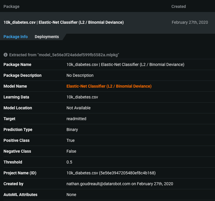 When this process completes, DataRobot adds your model package to the Model Packages tab, complete with the metadata for your model package.