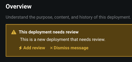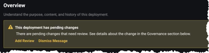 To approve a deployment change, select Add Review from the notification banner (also available under the Governance header):
