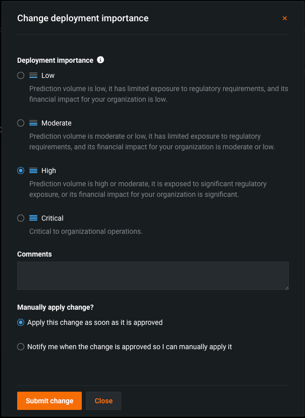 Before you deploy your model, you are prompted to assign an importance level to it: Critical, High, Moderate, or Low. Importance represents an aggregate of factors relevant to your organization such as the prediction volume of the deployment, level of exposure, potential financial impact, and more.