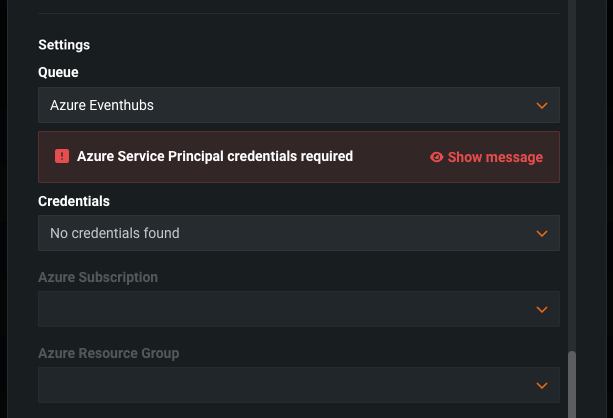 Select the Azure Service Principal Credentials for your Azure Event Hubs spooler and configure the Azure Subscription and Azure Resource Group fields accessible using the provided Credentials: