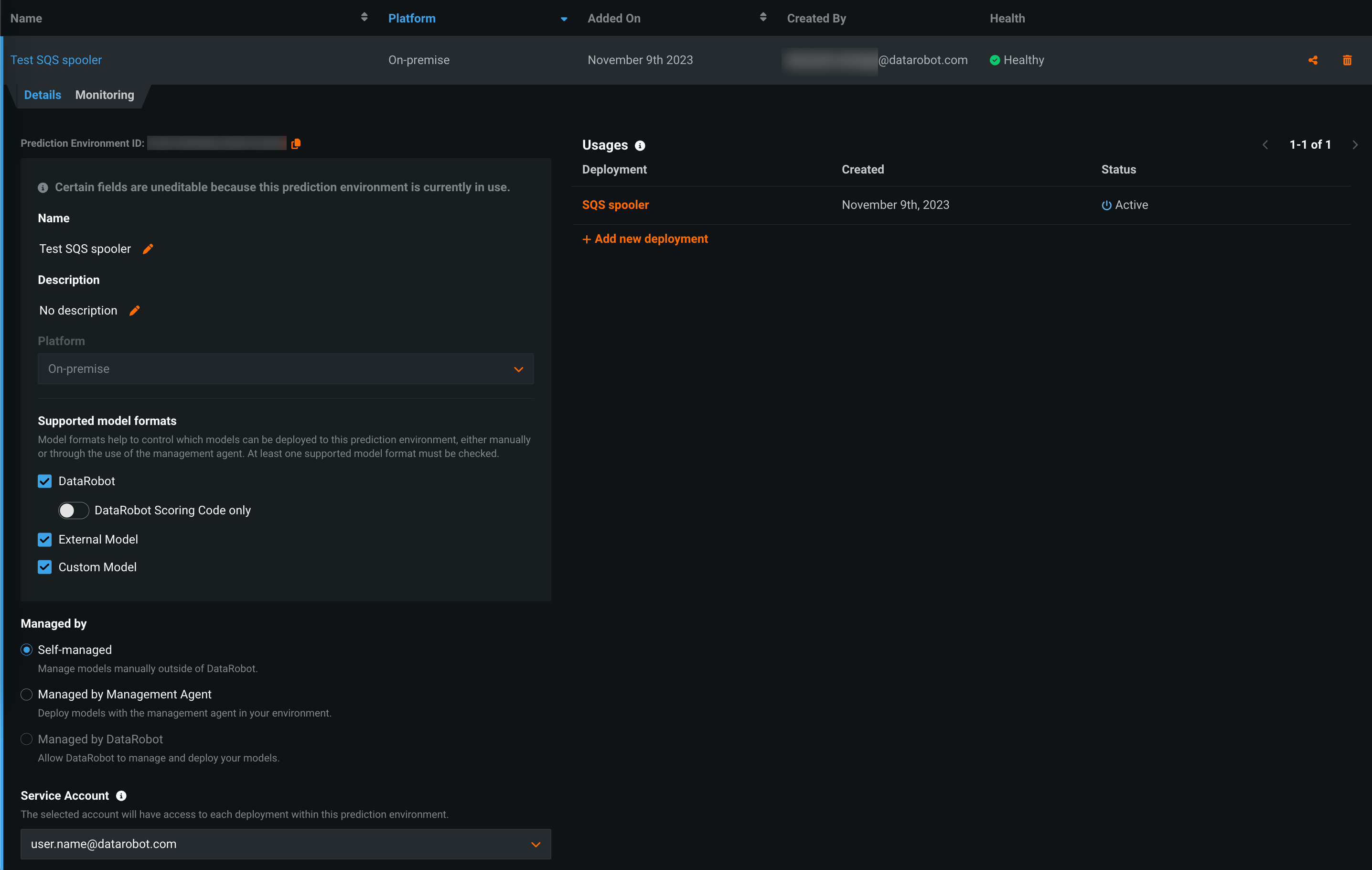 From the Details tab, you can edit the prediction environment Name, Description, Platform, Supported model formats, Managed by setting, and associated Service Account. In the Usages section, you can view and access deployments associated with the environment: