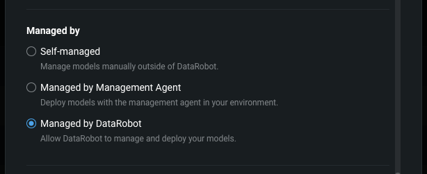 Under Managed by, select Managed by DataRobot. The following options are provided: