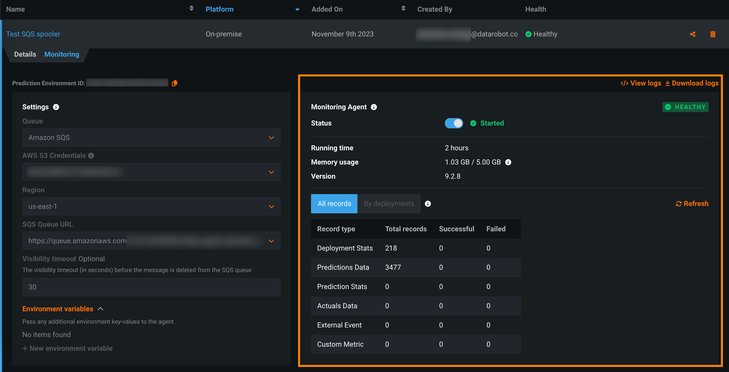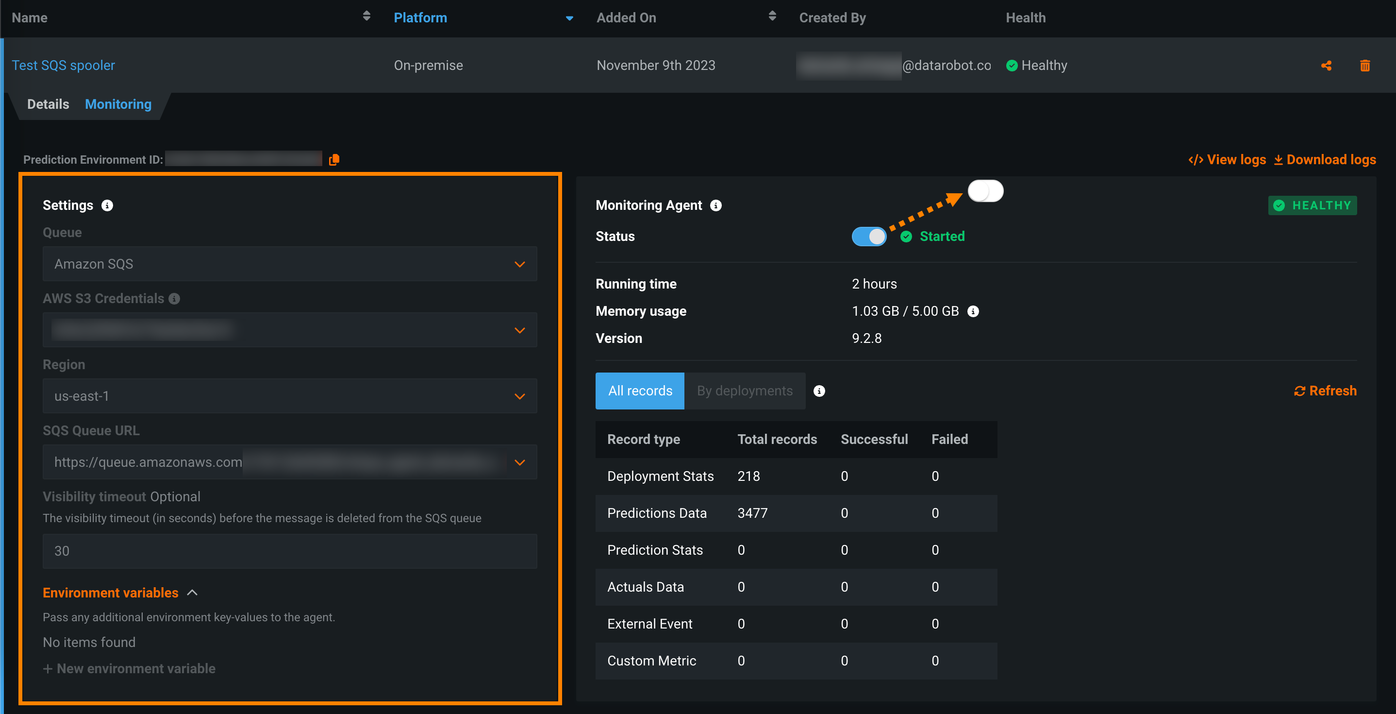 The monitoring agent typically runs outside of DataRobot, reporting metrics from a configured spooler populated by calls to the DataRobot MLOps library in the external model's code. Now available for preview, you can run the monitoring agent inside DataRobot by creating an external prediction environment with an external spooler's credentials and configuration details.