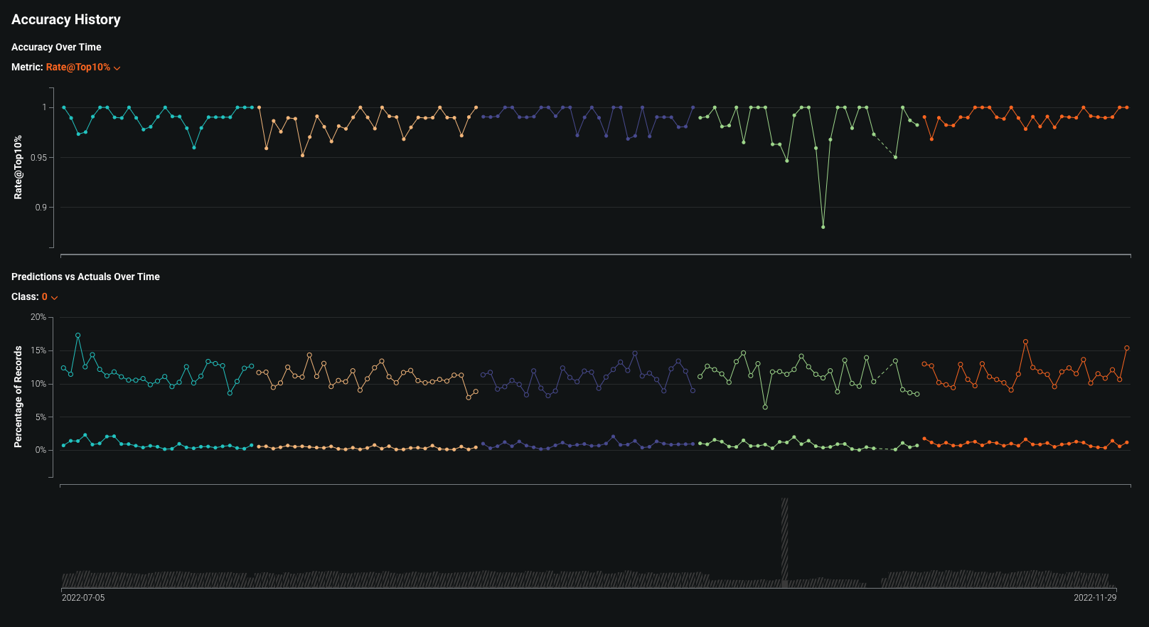 The timeline and bucketing work the same for classification and regression projects; however, for classification projects, you can use the Class dropdown to display results for that class.