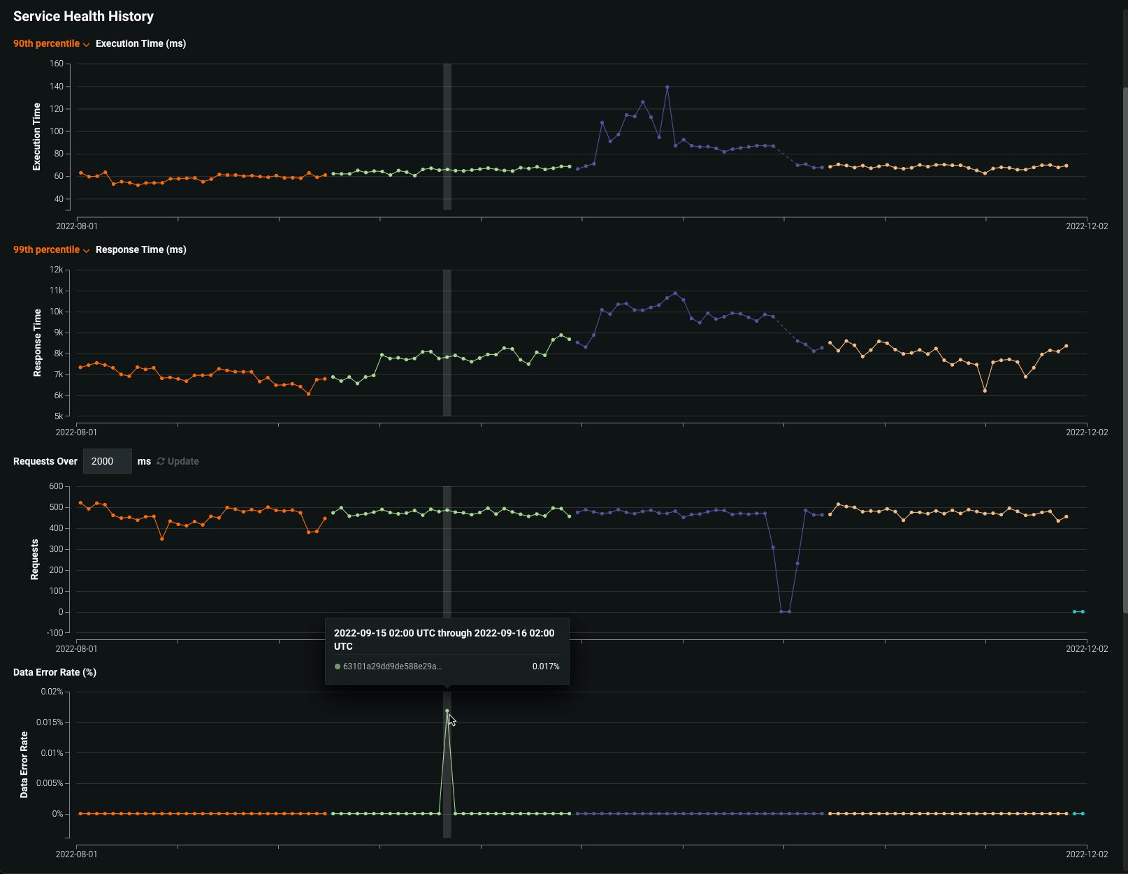 To view the details for a data point in a service health history chart, you can hover over the related bin on the chart: