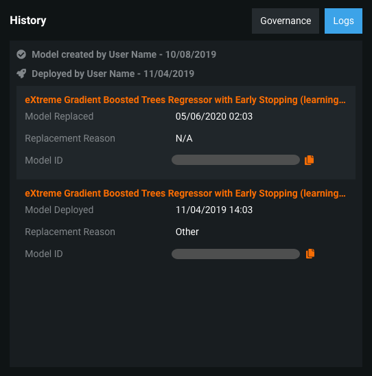 You can find a deployment's model-related events under History > Logs, including the creation and deployment dates and any model replacement events. Each model replacement event reports the replacement date and justification (if provided). In addition, you can find and copy the Model ID of any previously deployed model.