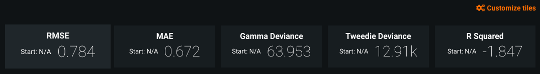 Deployment owners can configure multiple accuracy metrics for each deployment. The accuracy metrics a deployment uses appear as individual tiles above the accuracy graphs. Select Customize Tiles to edit the metrics used.
