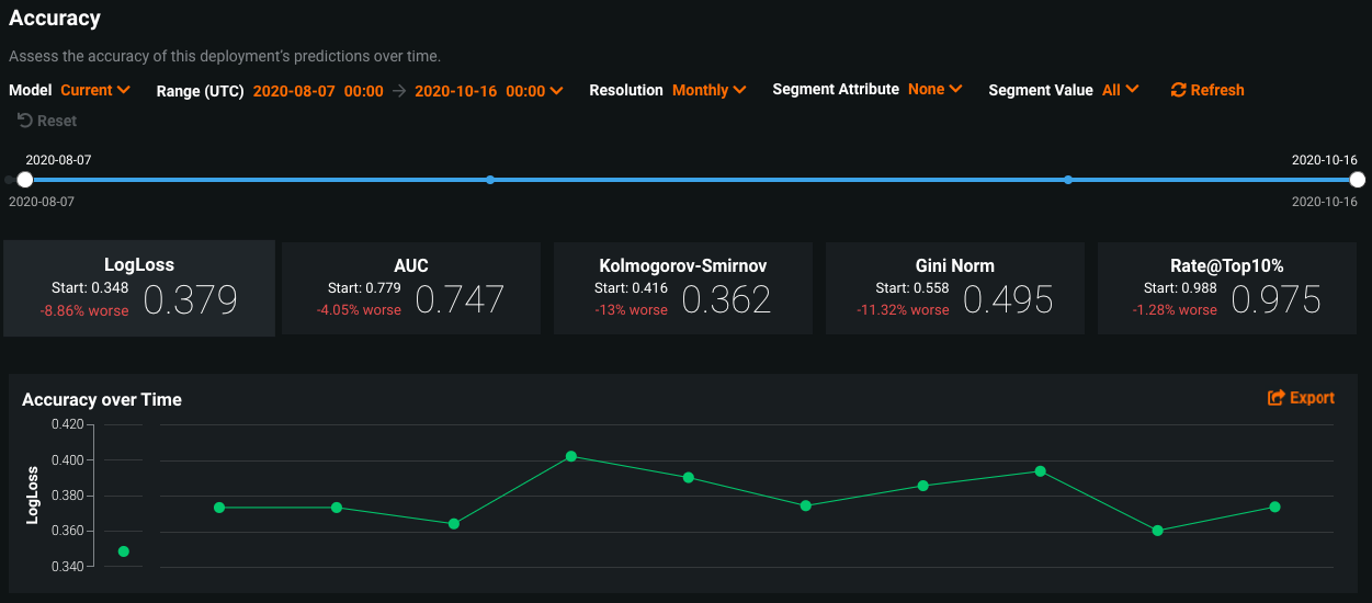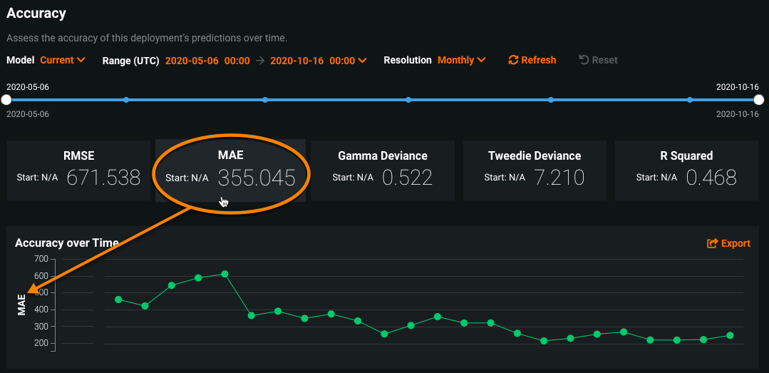 The Accuracy tab allows you to analyze the performance of model deployments over time using standard statistical measures and exportable visualizations.