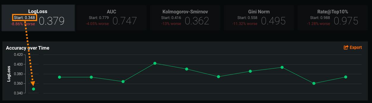 The Accuracy over Time graph displays the change over time for a selected accuracy metric value (LogLoss in this example):