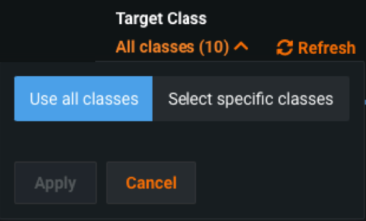 Multiclass deployments offer class-based configuration to modify the data displayed on the Accuracy graphs. By default, the graphs display the five most common classes in the training data. All other classes are represented by a single line. Above the date slider, there is a Target Class dropdown. This indicates which classes are selected to display on the selected tab.