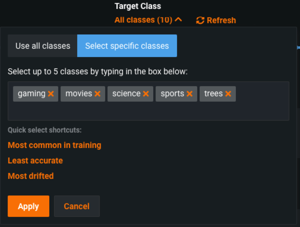 To display a specific class, select the second option. Type the class names in the subsequent field to indicate those that you want to display (up to five classes can display at once). DataRobot provides quick select shortcuts for classes: the five most common classes in the training data, the five with the lowest accuracy score, and the five with the greatest amount of data drift. Once you have specified the five classes to display, click Apply.