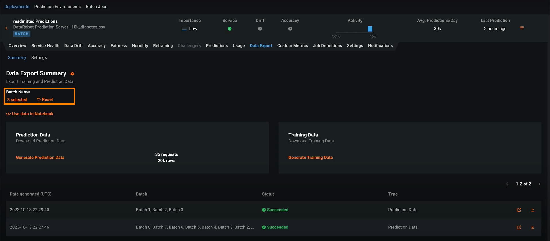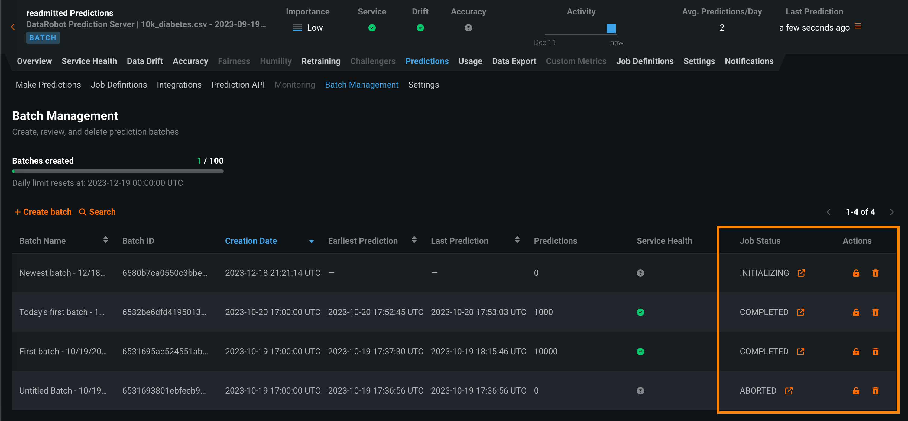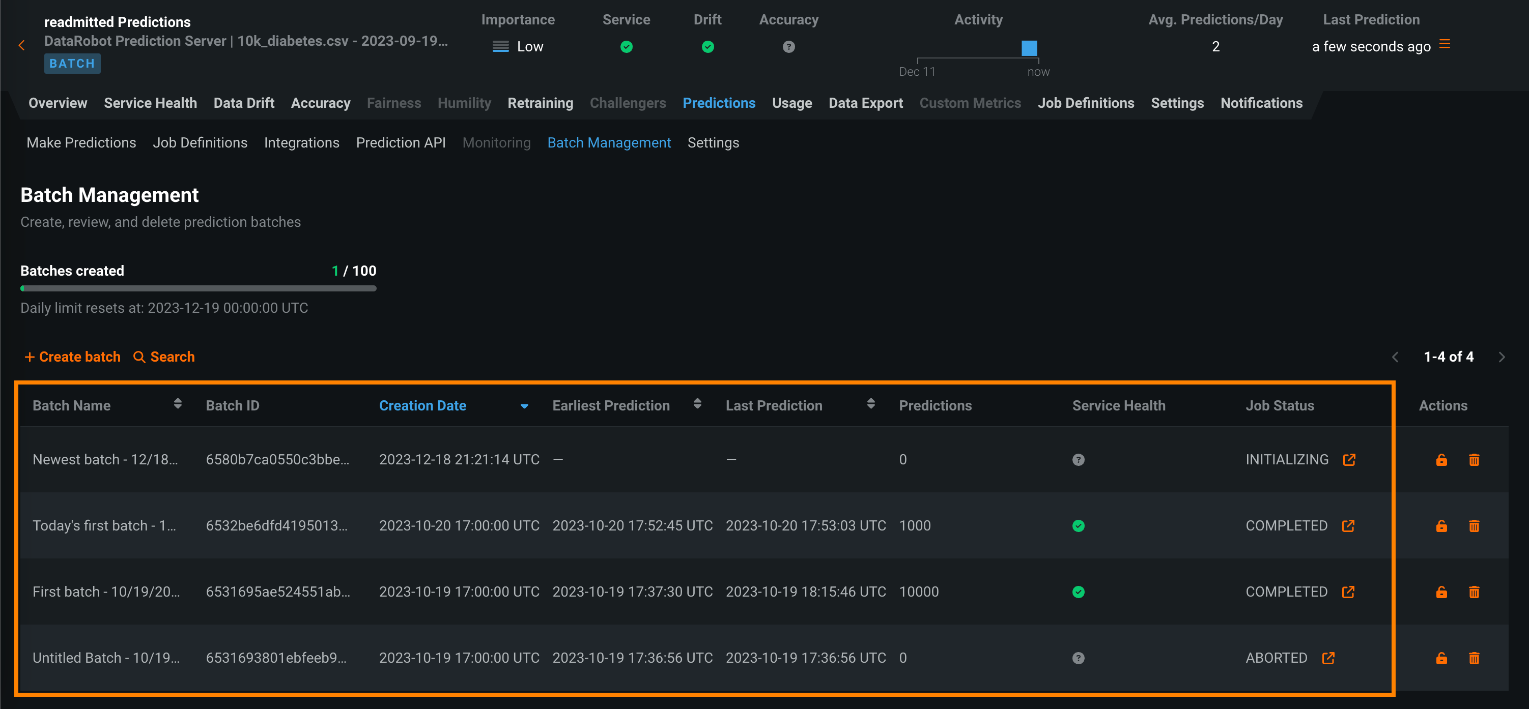 On the Predictions > Batch Management tab, in addition to creating batches, you can perform a number of management actions, and view your progress towards the daily batch creation limit for the current deployment.