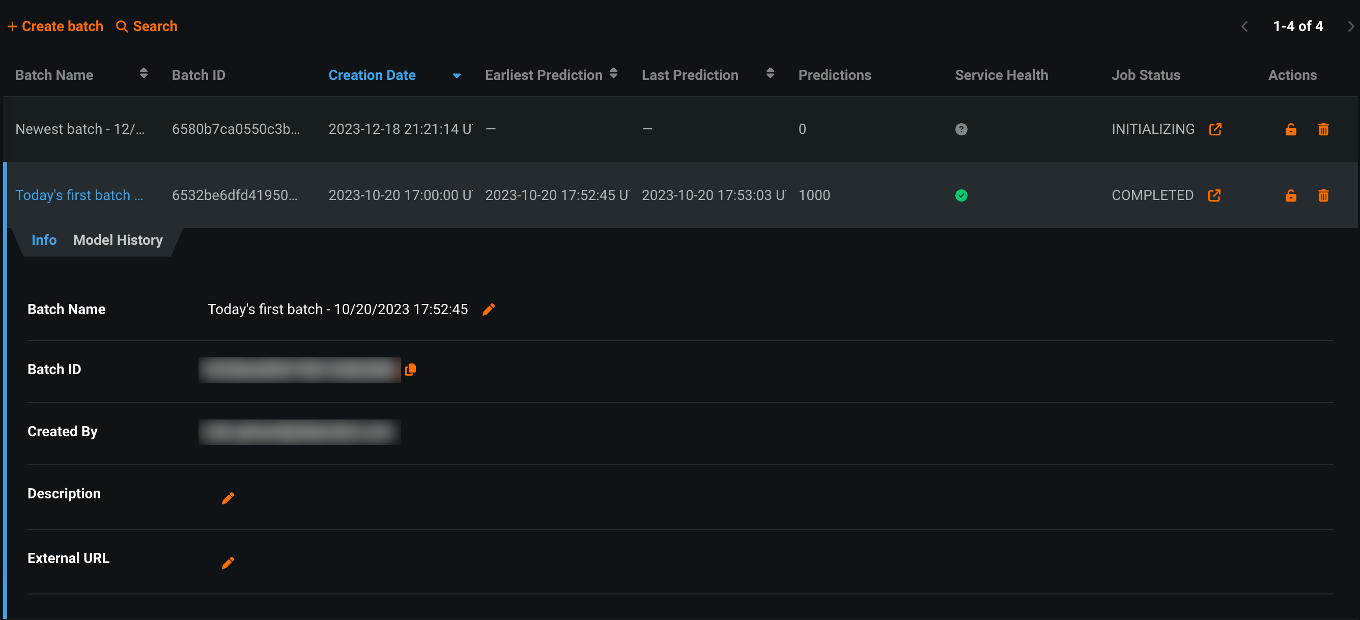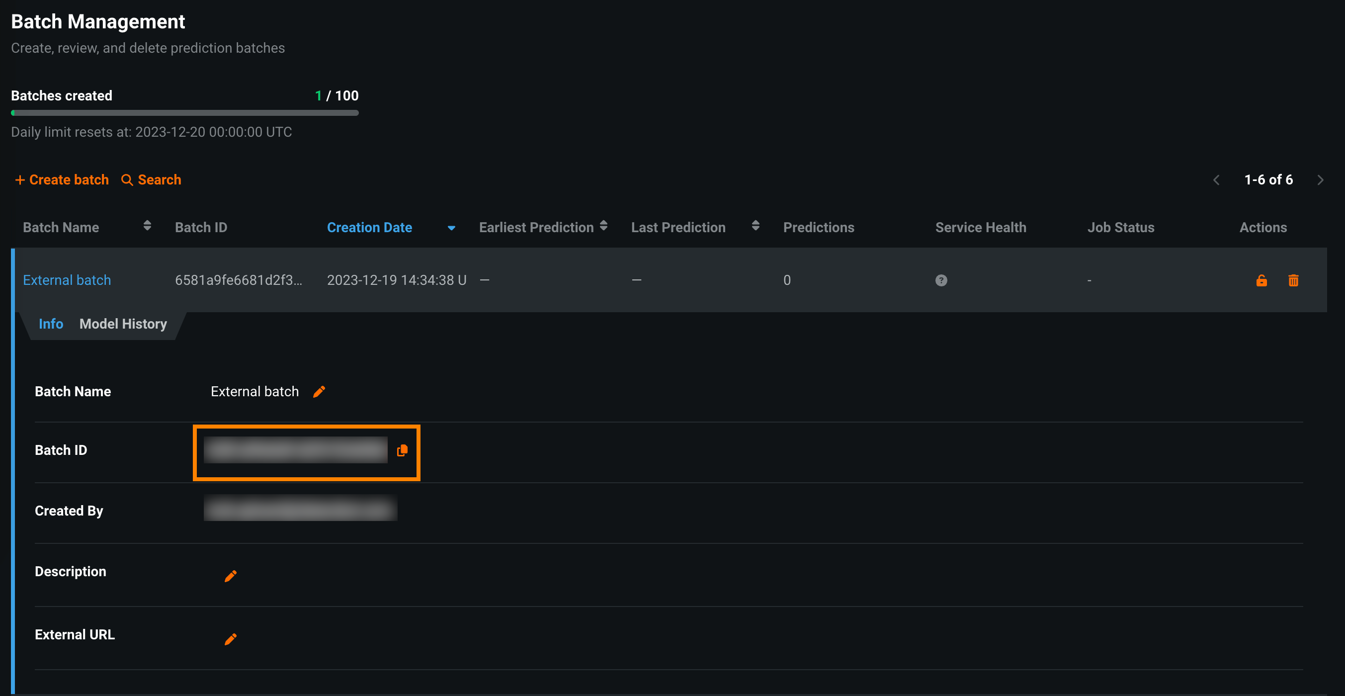 Click a batch to open the Info tab, where you can view and edit () the Batch Name, Description, and External URL. In addition, you can click the copy icon () next to the Batch ID to copy the ID for use in prediction code snippets: