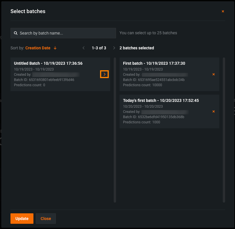 In the Select batches modal, click to select a batch, moving it to the right (selected) column. You can also click to remove a selected batch, returning it to the left (unselected) column.