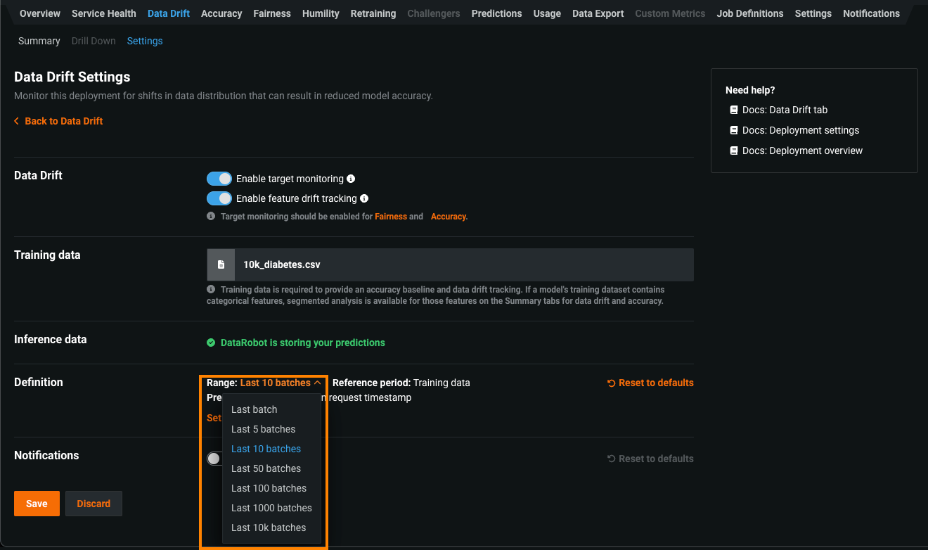 On the Data Drift > Settings tab, in the Definition section, select the Range of prediction batches to include in the deployment inventory's Drift indicator and click Save: