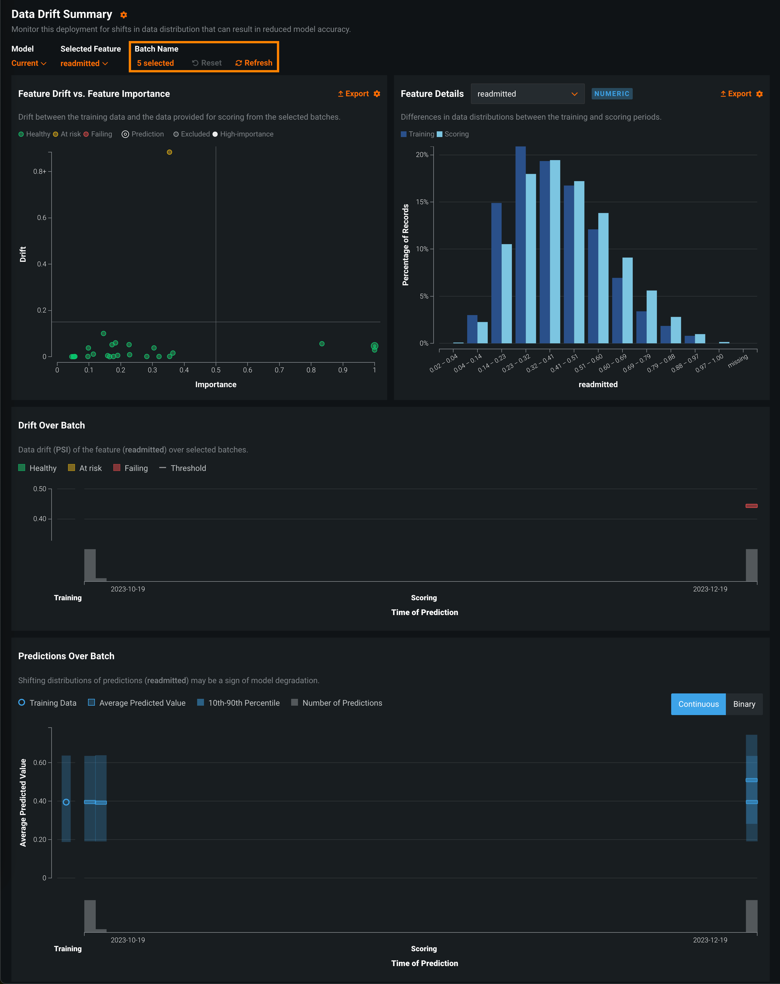 On the Data Drift tab, you can view the Feature Drift vs. Feature Importance, Feature Details, Drift Over Batch, and Predictions Over Batch charts. You can use the Batch Name selector to determine which batches are included: