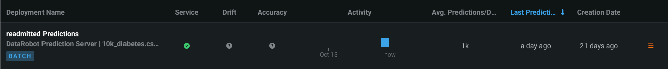 When a deployment has batch monitoring enabled, on the Deployments tab, in the Deployment Name column, you can see a BATCH badge. For these deployments, in the Prediction Health lens, the Service, Drift, and Accuracy indicators are based on the last few batches of predictions, instead of the last few days of predictions. The Activity chart shows any batch predictions made with the deployment over the last seven days: