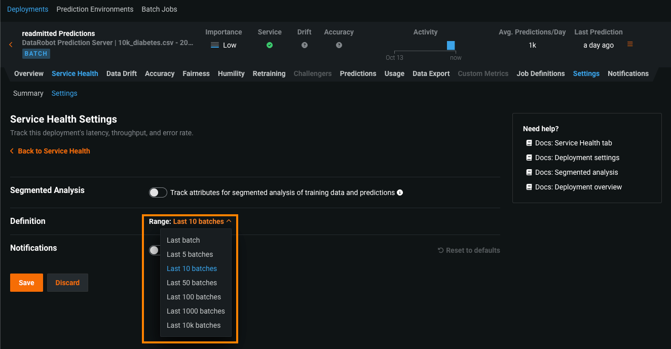 On the Service Health > Settings tab, in the Definition section, select the Range of prediction batches to include in the deployment inventory's Service indicator and click Save: