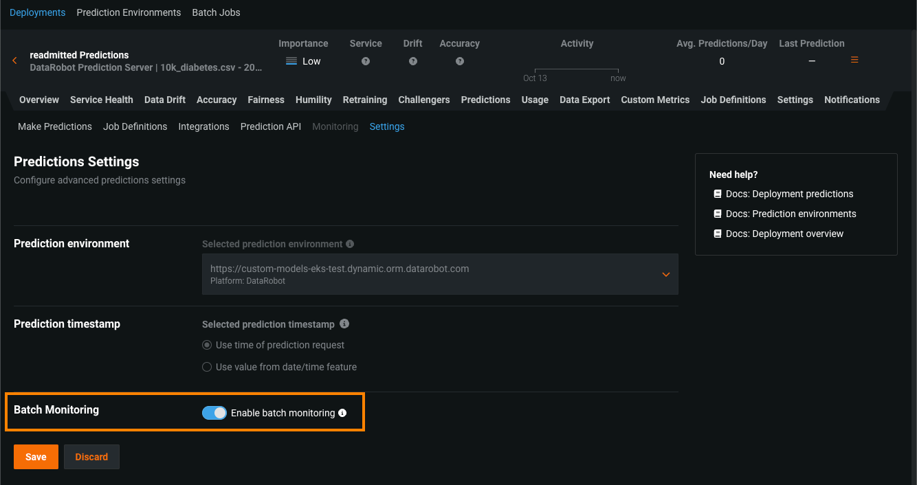 If you already created the deployment you want to configure for batch monitoring, navigate to that deployment's Predictions > Settings tab. Then, under Predictions Settings and Batch Monitoring, click Enable batch monitoring and Save the new settings: