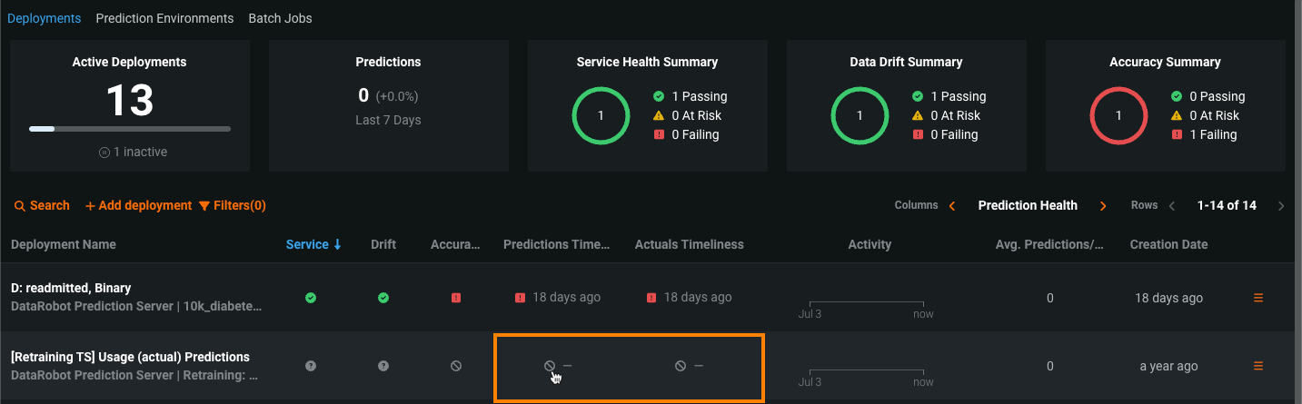 In the Deployments inventory, click Filters to apply Predictions Timeliness Status and Actuals Timeliness Status filters by status value:
