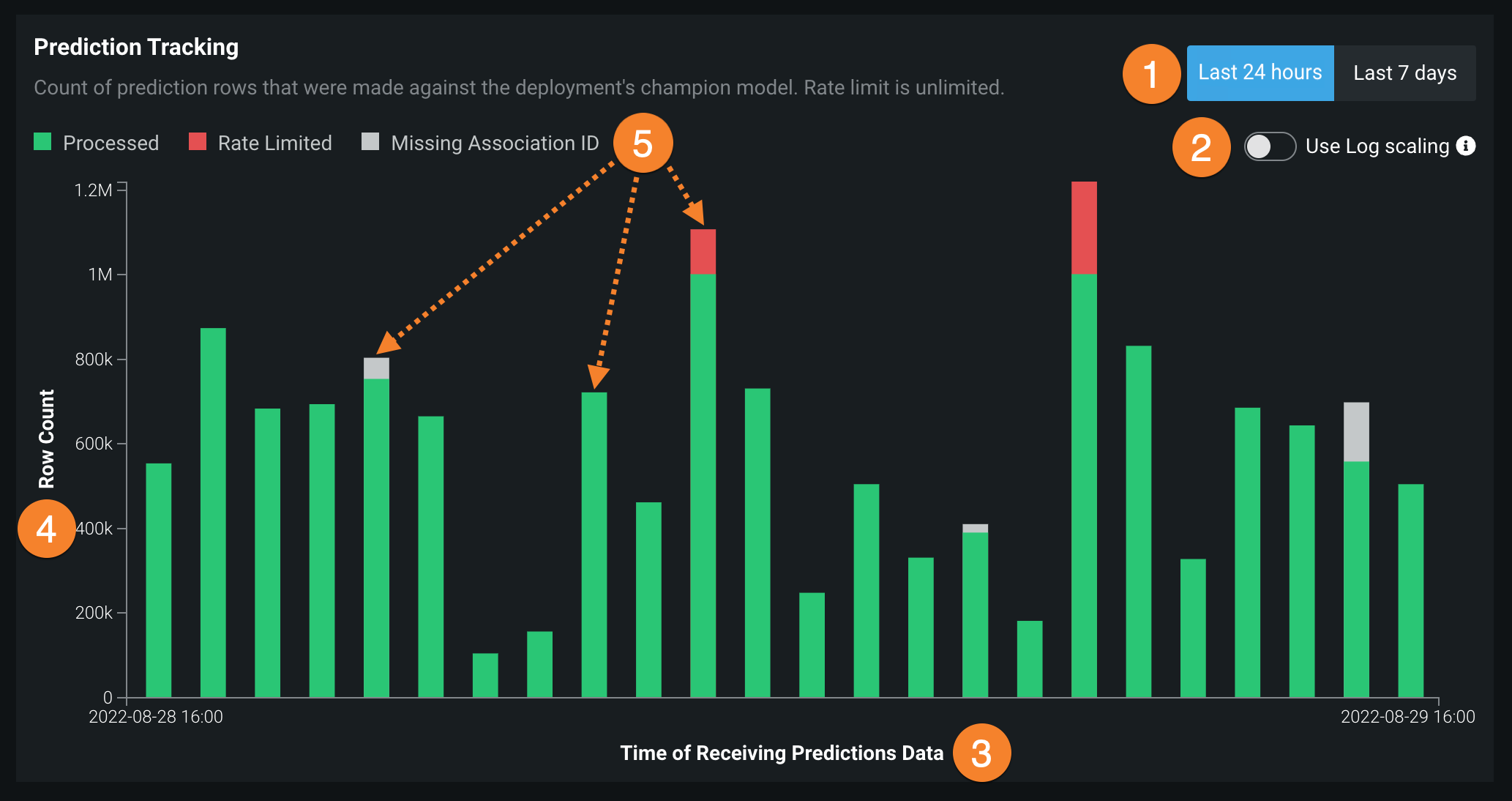 | 2 | Use log scaling | Applies log scaling to the Prediction Tracking chart for deployments with more than 250,000 rows of predictions. |
