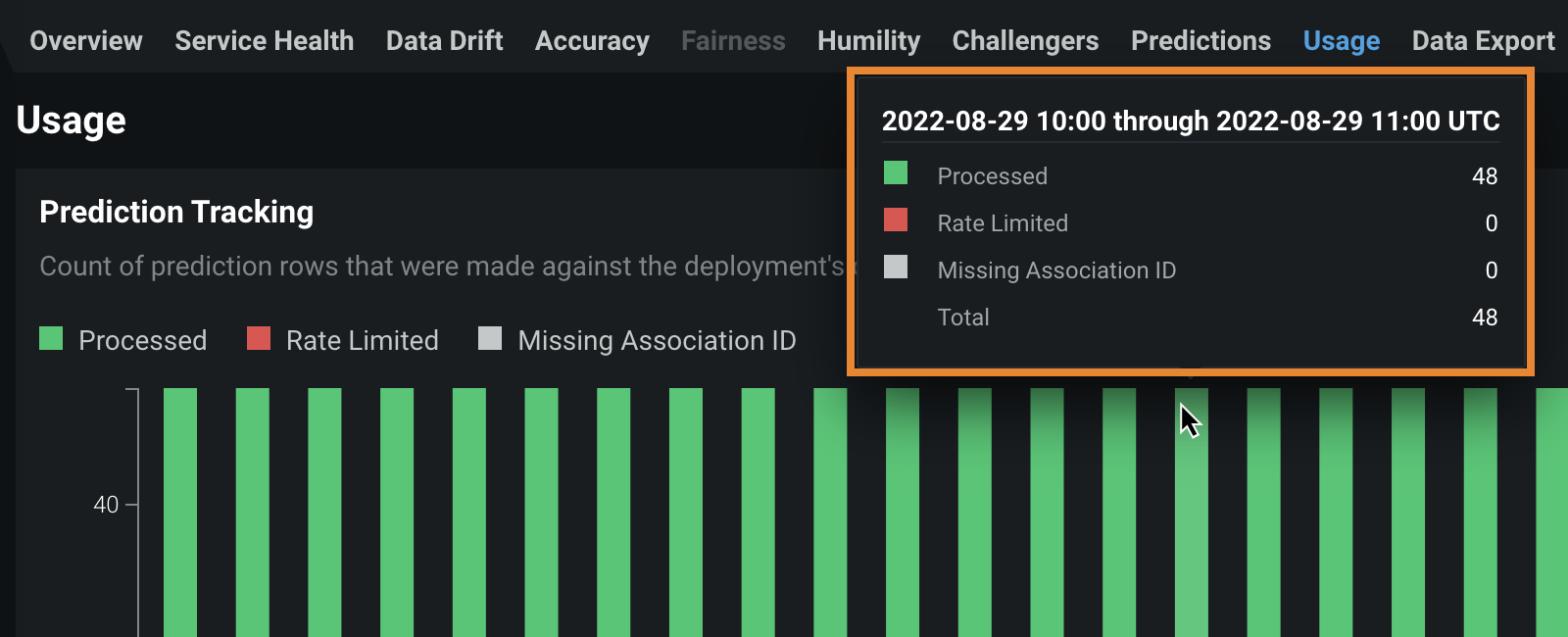 The Usage tab displays the number of prediction rows subject to your organization's monitoring rate limit. However, rate limiting only applies to prediction monitoring, all rows are included in the prediction results, even after the rate limit is reached. Processing limits can be hourly, daily, or weekly—depending on the configuration for your organization. In addition, a megabyte-per-hour limit (typically 100MB/hr) is defined at the system level. To work within these limits, you should span requests over multiple hours or days.